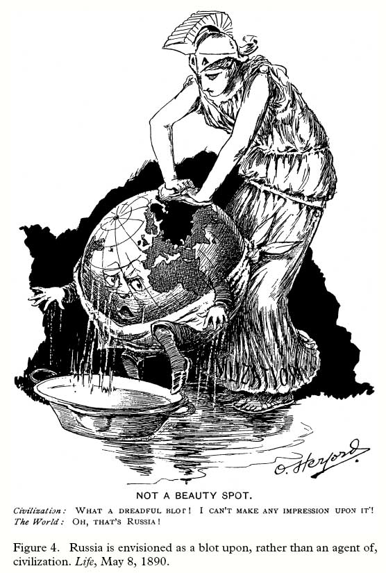 Foglesong writes of a legacy of American efforts to re-make Russia in its image, and his book includes a number of hilarious (if scary) political cartoons from the late 19th and early 20th Century. Yes, friends, themes include Satan, the brilliant civilization that the US supposedly brings to Russia, murky clouds of “Asiatic” darkness, and the occasional globe-scrubbing.