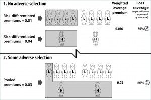 The weighted average of the premiums paid in Scenario 1 is (4 x 0.01 +1 x 0.04)/5 = 0.016. Since higher and lower risks are insured in the same proportions as they exist in the population, there is no adverse selection. The expected losses compensated by insurance for the whole population, which I call the ‘loss coverage’, can be indexed by (4 x 0.01 + 1x 0.04) / (8 x 0.01 + 2 x 0.04) = 0.50.