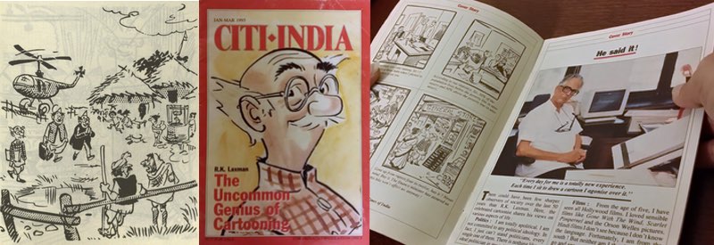 Left: Laxman’s pocket cartoon, ‘You Said It’, courtesy R. K. Laxman. Middle: Cover, Citi-India (1993). Right: Author examining Citi-India with a cover story on R.K. Laxman. Photo: Ritu Gairola Khanduri.