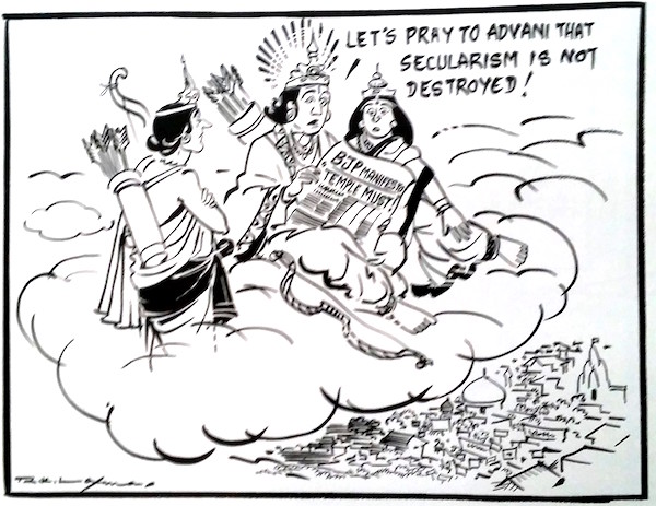 In a special Daedalus issue titled, “Another India,” Laxman cautioned that in delicate situations when religion and politics mix, it was “wise for the cartoonist to set aside his freedom a bit” (1989: 90). Laxman advocated a “general view” that could point the social evil “without apportioning the blame to one party.” The introduction to Laxman’s article noted “while always political, India’s cartoon character satirize without shrill calls to action.” Some will disagree.
