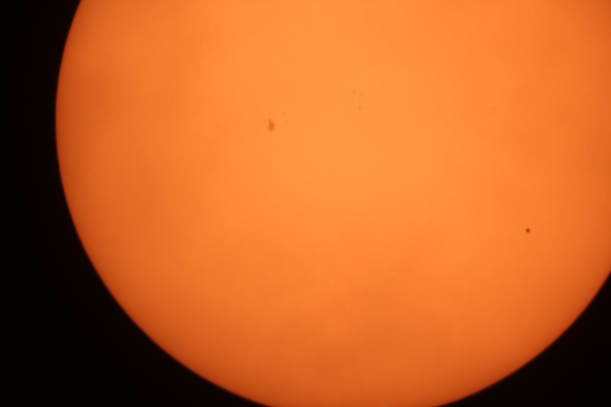 Figure 1: Transit of Mercury photographed on 9 May 2016 from Berry College, GA (USA). Mercury is the tiny black spot on the lower right. Some sunspots are also visible. Photo credit: Todd Timberlake