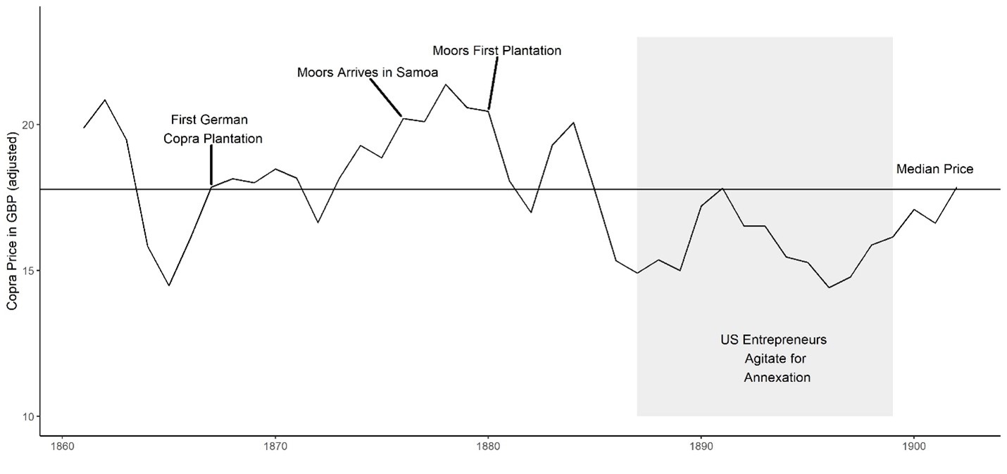 This is illustrated in the following figure. In Samoa, American imperialists followed rising copra prices (dried coconut husks). The primary American planter, H.J. Moors, arrives in a period of growing prices, creating the first American plantation on the islands. Competition with Germany, during a period of price decline, sees him travel to Washington, demanding that the United States seize the islands.