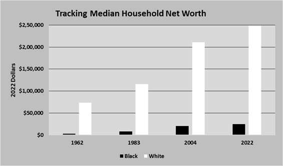 A recent study asked over a thousand people their perceptions of the wealth gap between White and Black Americans. Respondents were invited to compare the wealth of a typical Black household assuming White households held $100, both currently and in 1963. They could choose among answers that ranged from $10 to $200. The typical answer to current circumstances is that Black households hold $90 for every $100 held by Whites. Turning to 1963, they estimated that Black households held not quite $50 (just under half) for every $100 held by Whites. Although at odds with reality, these figures corroborate the dominant narrative that Black progress over the decades has largely eliminated any racial disparities in wealth.