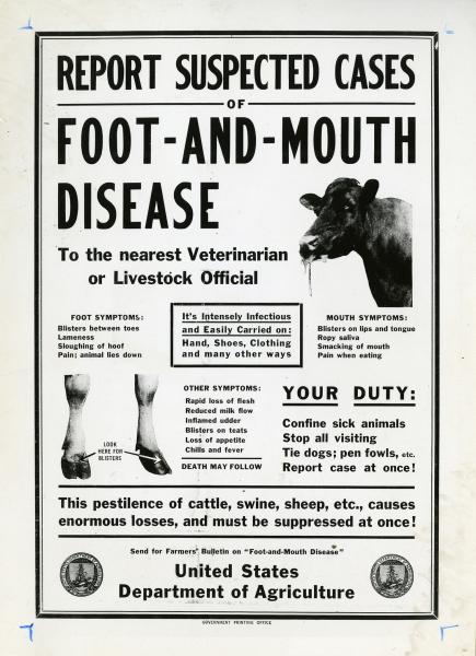 Image: Report suspected cases of foot-and-mouth disease poster. Historical Photography. Row 5 Draw 1, 23. Foot-and Mouth-Disease. Folder 1. USDA National Agricultural Library.