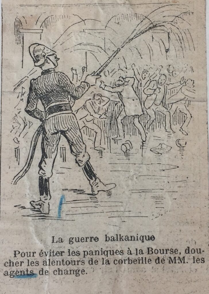 Caption: ‘To avoid panics on the stock exchange, shower the area around the stockbrokers’ trading floor’ (Cartoon from November 1912, during the First Balkan War).