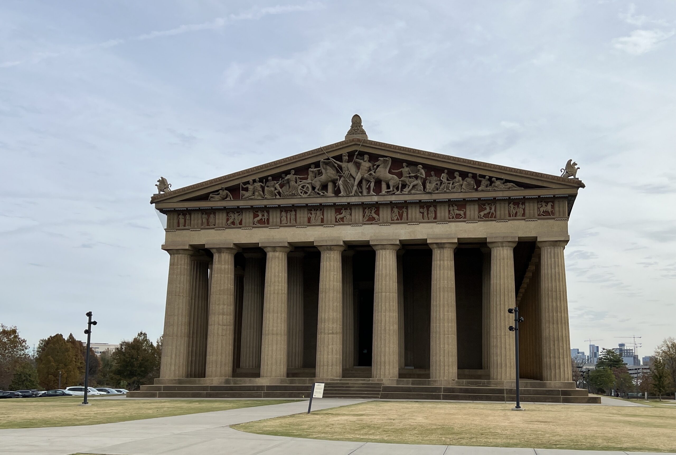 Because Nashville defined itself as a new Athens, the fair organizers built a replica of the Parthenon as its architectural centerpiece. Based on archaeological reports, photographs, and drawings, William C. Smith designed an archaeologically-informed building of staff, a type of plaster of Paris. The building’s sculptures were inspired by the original: the pediments depicted the battle between Athena and Poseidon to be Athens’ patron god, and the metopes showed centauromachy, a mythological battle between the Lapiths, a legendary Greek people, and the centaurs. A centauromachy was typically interpreted as symbolizing the battle between civilization and barbarism. Nashville’s Parthenon even incorporated color, making this replica even more like the ancient Greek buildings, which were also painted. Appropriately, it was the fine arts building. When the fair closed, the Parthenon was one of the few buildings to survive. In the 1920s, the building was renovated and made permanent.