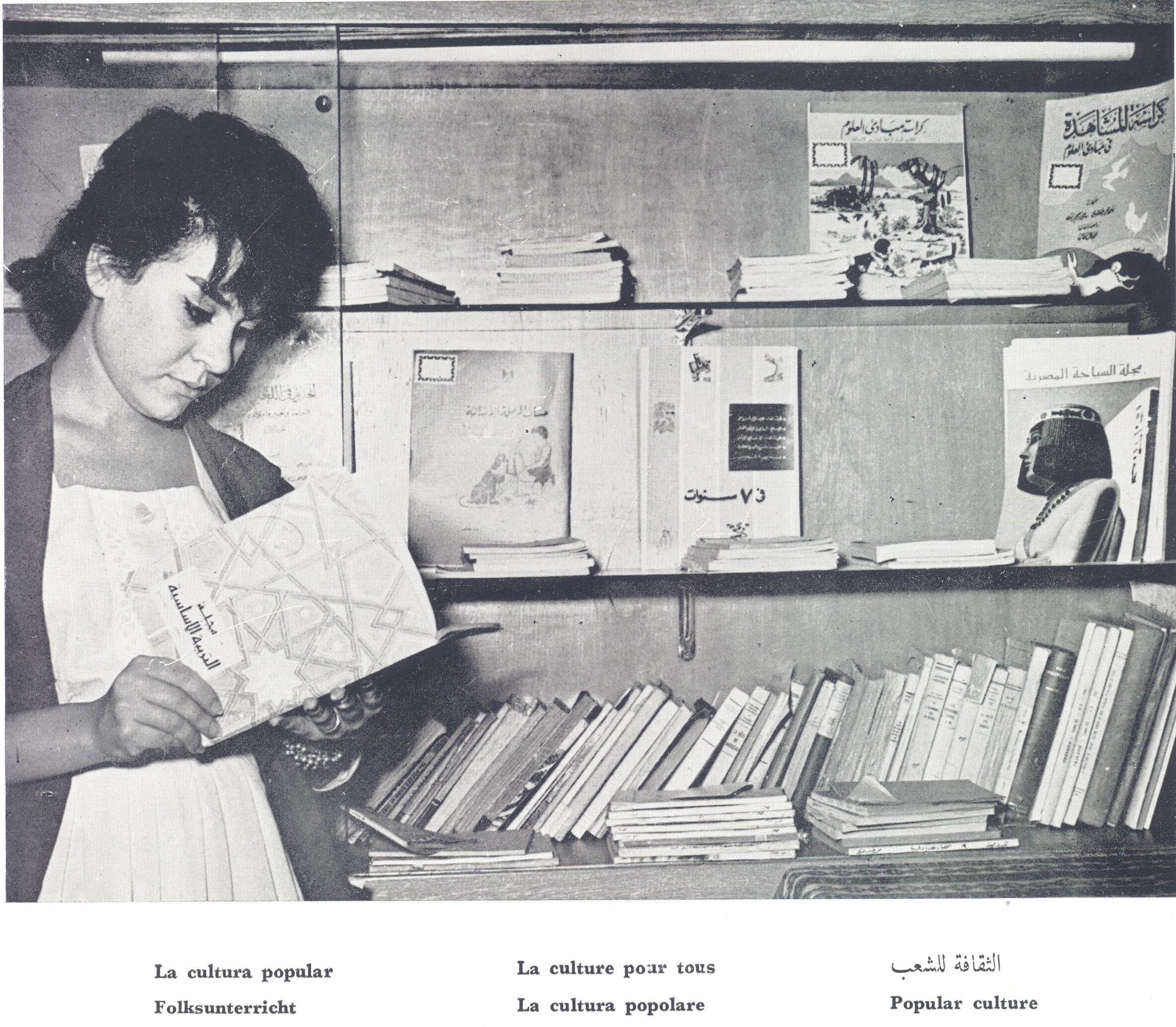 The banner image illustrates what I mean. This photograph was printed in a glossy hardback book simply called The United Arab Republic, 1963. The book is full of pictures about Egypt’s achievements since the 1952 revolution, in sectors such as industry, agriculture, transportation, construction, education, and indeed, ‘culture’. Images of new mechanical equipment, new buildings, new infrastructure, peasants in fields, workers in factories, or students in schools collectively illustrate the nation’s progress. Progress in ‘culture’, here, is portrayed through an ostensibly middle-class young woman, donning a fashionable dress and haircut, attentively leafing through the latest books printed by the Ministry of Culture.